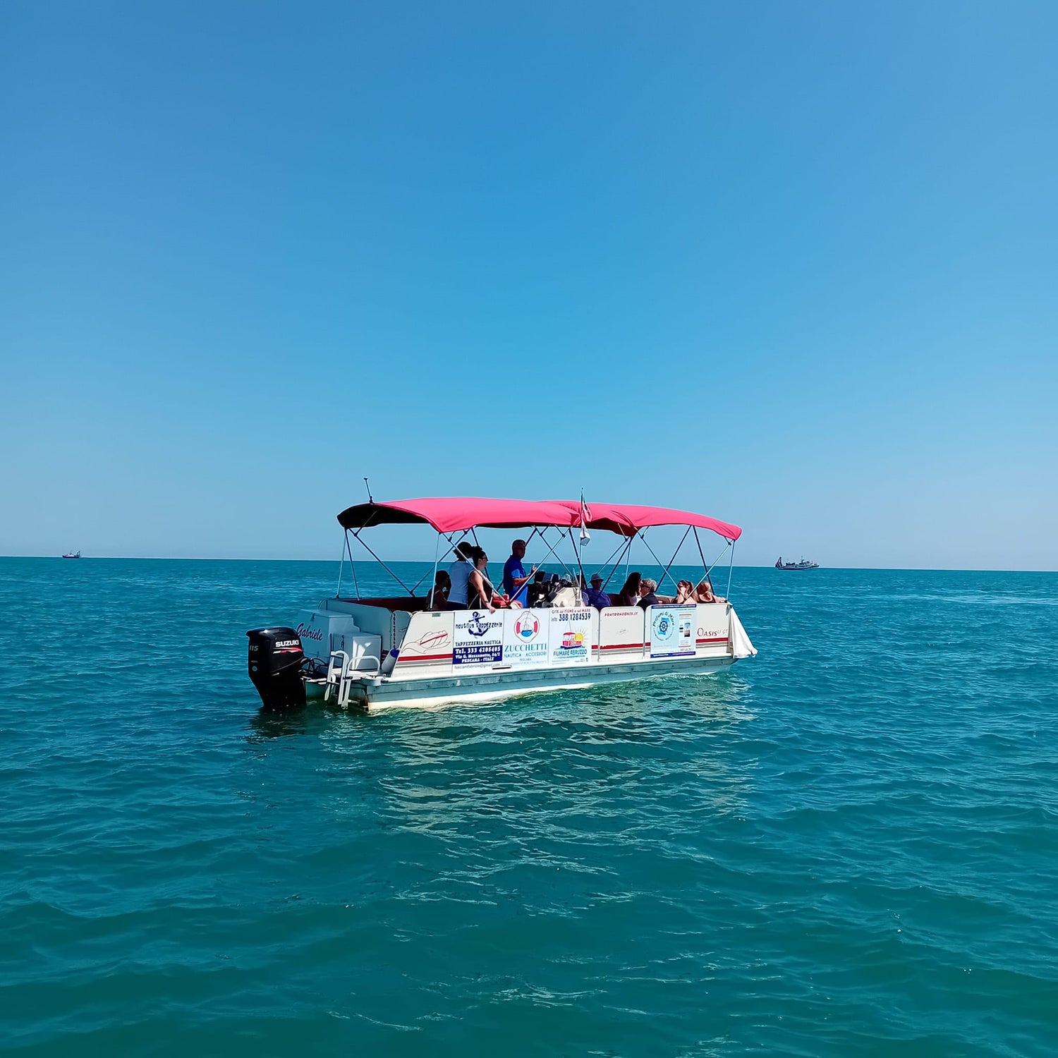 Le escursioni sono effettuate dal nostro PONTOON: un’imbarcazione da turismo che consente di imbarcare fino a 16 persone in totale sicurezza, adatta a grandi e piccini.